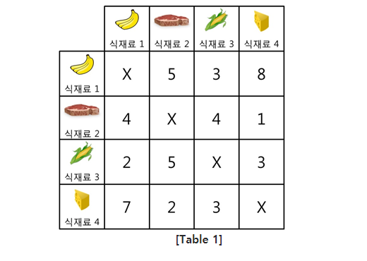 식재료 1과 식재료 2를 A음식으로 만들고 식재료 3과 식재료 4를 B음식으로 만드는 경우를 생각하자.